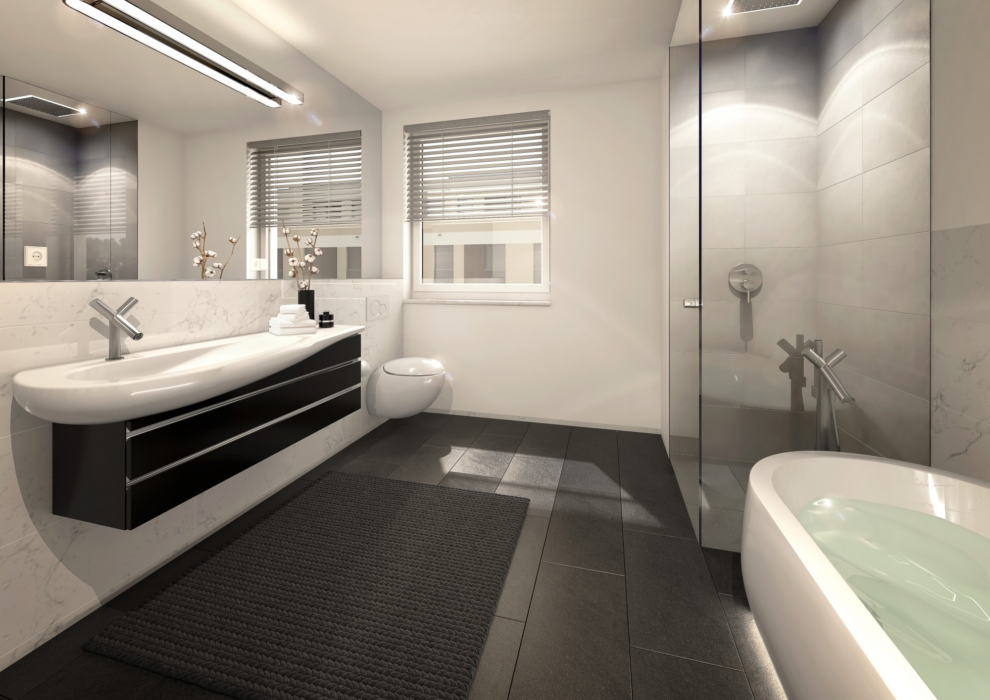 • Großformatige, moderne Fliesen im Bad